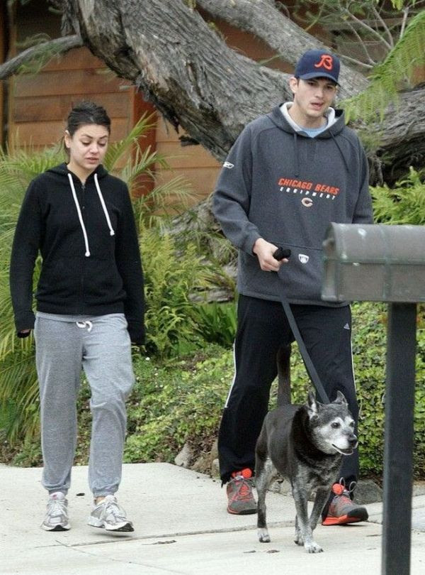Обявена от списание Esquire, за най-сексапилната жена на 2012 година, Мила Кунис разхожда кучето си, заедно с приятеля и Аштън Къчър, без да е гримирана.